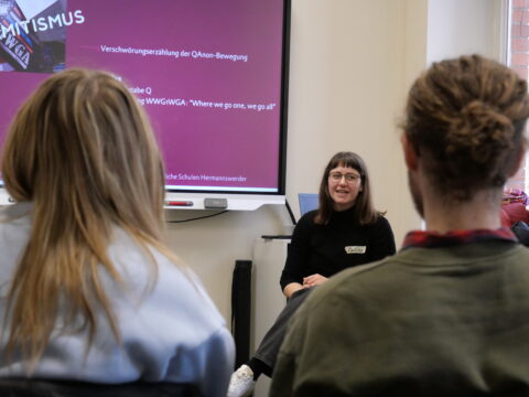 Zu psychologischen Aspekten im Zusammenhang mit Verschwörungserzählungen informierte Janek Buchheim von demos, dem Brandenburgischen Institut für Gemeinwesenberatung. Hier ging es vor allem um die psychologischen Elemente und Mechanismen, die dazu führen können, dass Menschen Verschwörungserzählungen glauben. Buchheim gab den Schüler/innen daneben Tipps für den Umgang mit verschwörungsgläubigen Personen.
